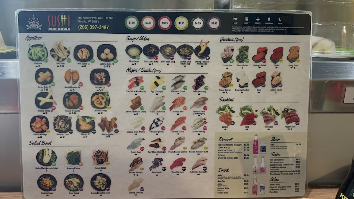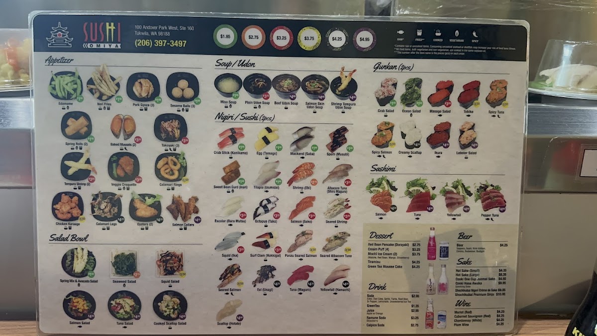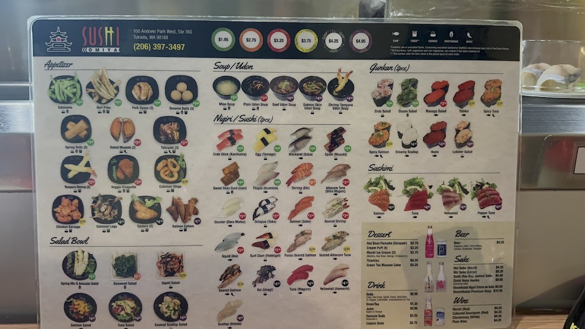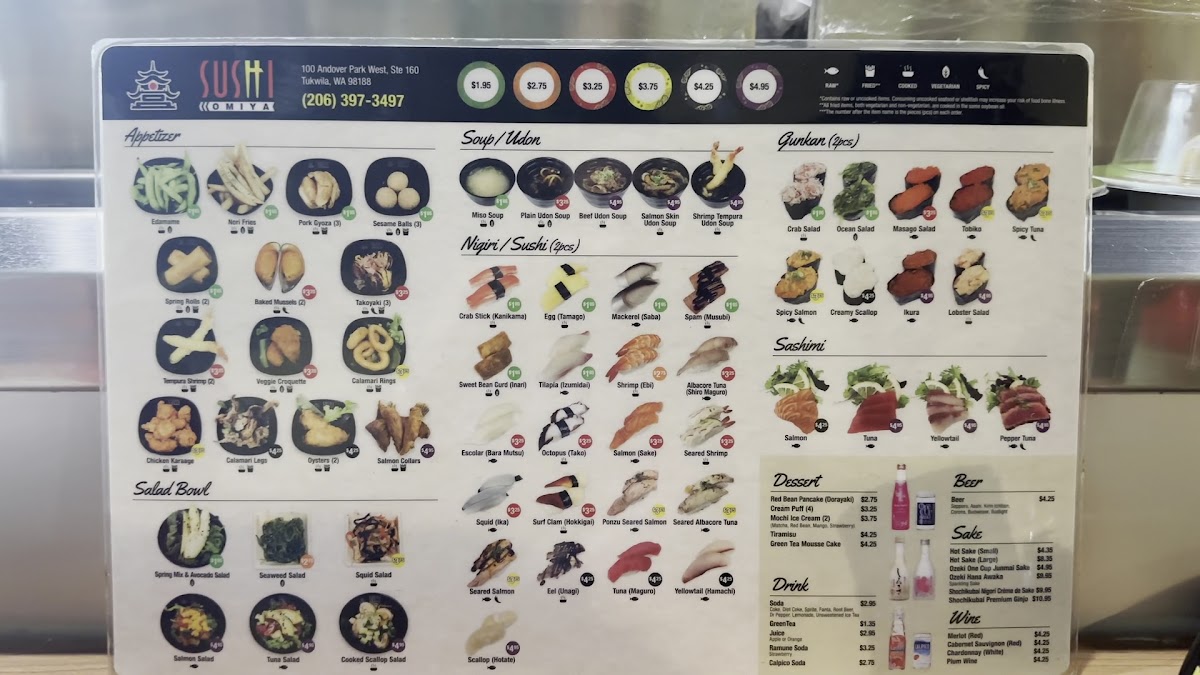 From a reviewer’s perspective, the menu at Sushi Omiya Factoria offers a well-rounded selection that covers everything from classic sushi to comforting hot dishes and desserts, making it easy to find something for every taste. The Nigiri / Sushi (2pc) options like Eel (Unagi), Seared Shrimp, Egg (Tamago), and the premium A5 Seared Wagyu 1 Pc stand out for variety, while appetizers such as Sesame Balls (3), Tempura Shrimp (2), Baked Mussels (2), and Chicken Karaage provide great starters. Fresh options like Tuna Sashimi, Yellowtail Sashimi, and rolls such as Rainbow Roll (4), Jalapeno Roll (4), and Seattle Roll (4) make the sushi selection appealing, and heartier choices like Tonkotsu Chashu Udon Soup and Beef Udon Soup add balance to the menu. To finish, desserts like Mochi Ice Cream (2), Tiramisu, and Taiyaki offer a sweet ending, rounding out a menu that feels both varied and satisfying.